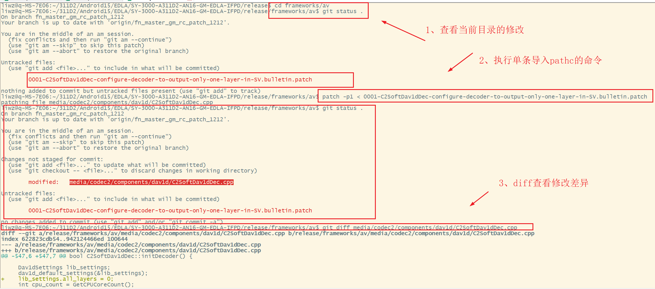git apply xxx.patch # 执行:正式导入补丁,合入代码修改