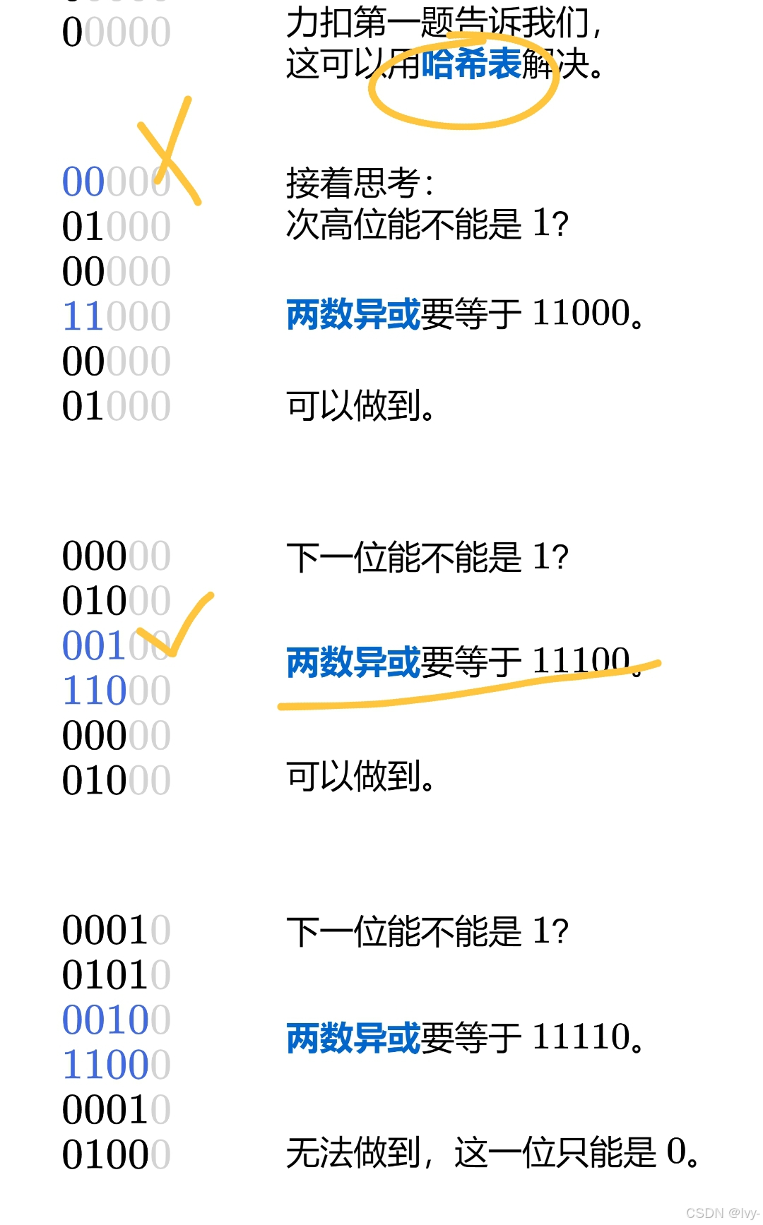 贪心+hash,从最高位到最低位逐位确定最大异或值