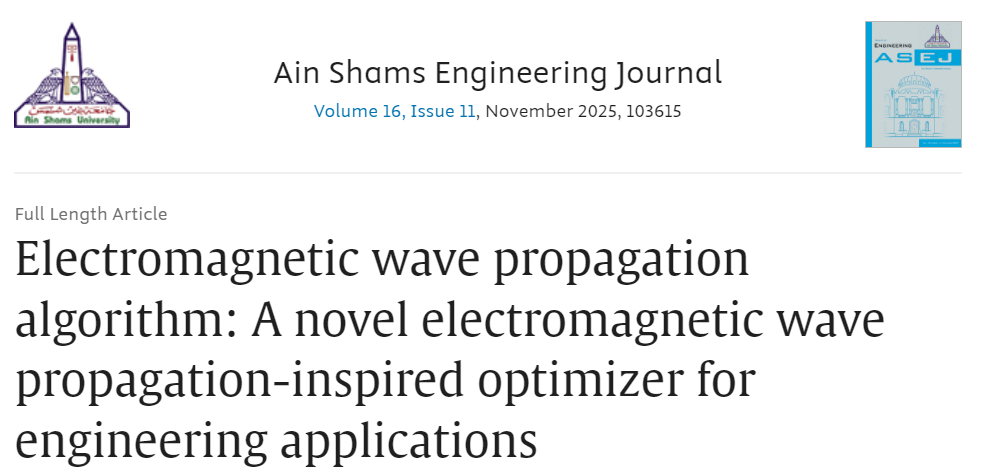 Muhammad Abdullah, Khurram Saleem Alimgeer, Ghulam Hafeez, Baheej Alghamdi, Ahmed S. Alsafran, Muhammad Zeeshan Babar,Electromagnetic wave propagation algorithm: A novel electromagnetic wave propagation-inspired optimizer for engineering applications,Ain Shams Engineering Journal,Volume 16, Issue 11,2025,103615,https://doi.org/10.1016/j.asej.2025.103615.