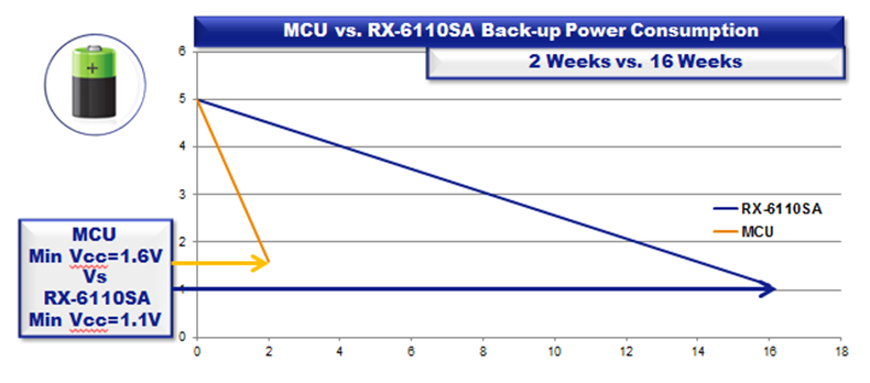 MCU 与 RX-6110SA 备用功耗对比: