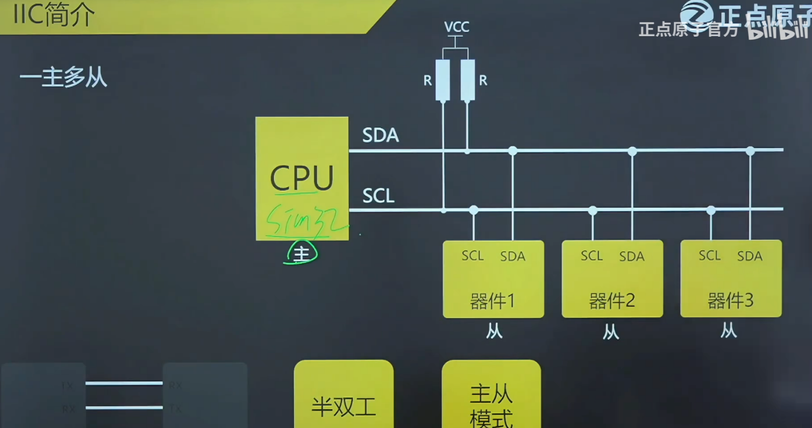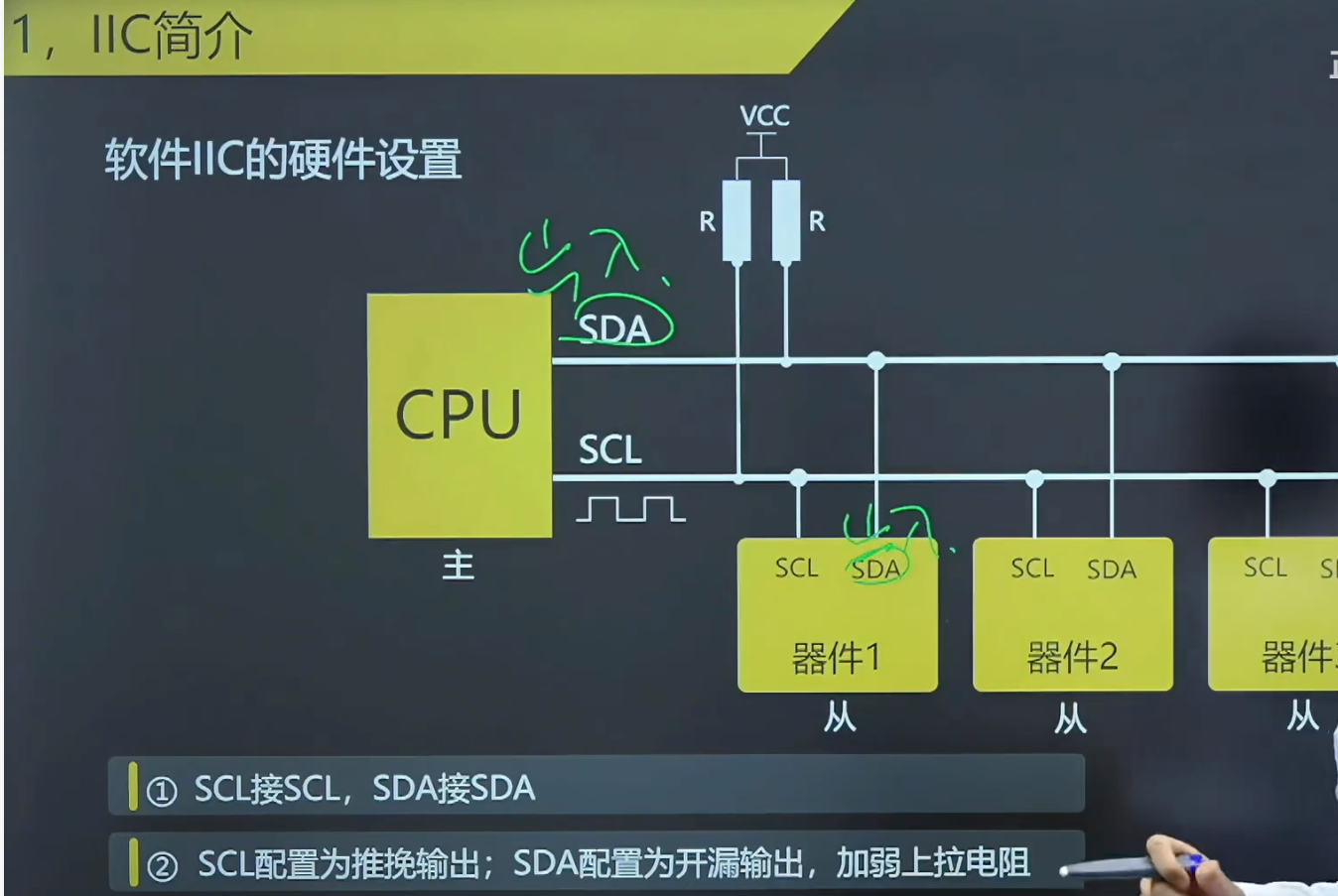 而 SCL 可以用推挽输出(因为主设备完全控制 SCL,从设备不主动拉低),但实际工程中也常和 SDA 一样用开漏 + 上拉(兼容多主设备场景)。