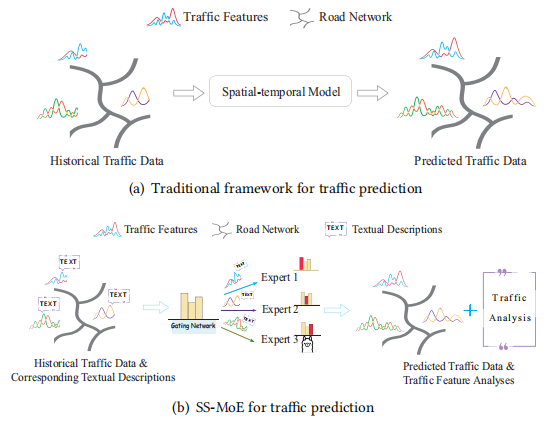 本推文介绍一个名为SS-MoE的创新性交通预测框架,有效解决了现有LLM交通模型语义利用率低和任务适应性差的问题。该框架设计了粗细粒度分层提示词作为辅助知识库;构建了包含空间、语义及通用专家的混合架构以动态适应多模态数据;并实现了预测结果的自然语言解释。广泛的实验结果证明,SS-MoE不仅在标准预测和少样本场景下结果均优于基线模型,还能提供具有洞察力的交通分析,为构建更智能、透明的交通管理系统提供了有力支持。
