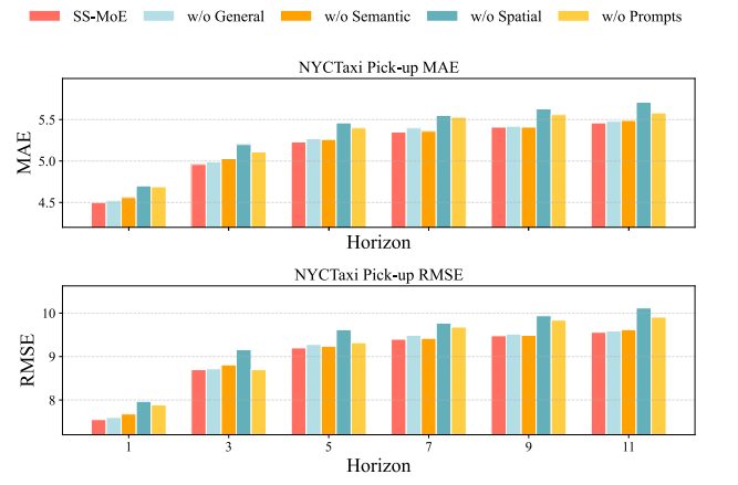 为了验证SS-MoE框架中各个组件的有效性,论文在NYCTaxi Pick-up数据集上进行了详尽的消融研究。实验设置了多种变体,分别移除了通用专家、语义专家、空间专家,以及移除了所有文本提示词。实验结果表明,移除粗细粒度提示词会导致预测误差上升,证明了文本语义信息是对时空嵌入特征的有效补充。此外,移除任一专家模块均导致所有预测时间步上的性能下降,这有力验证了混合专家MoE架构在捕捉多样化交通模式方面的必要性。
