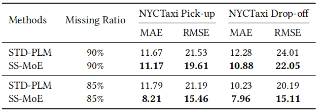 实验结果显示,SS-MoE在所有数据集和指标上均表现优异。在NYCTaxi和NYCBike的需求预测任务中,SS-MoE显著优于所有基线模型。