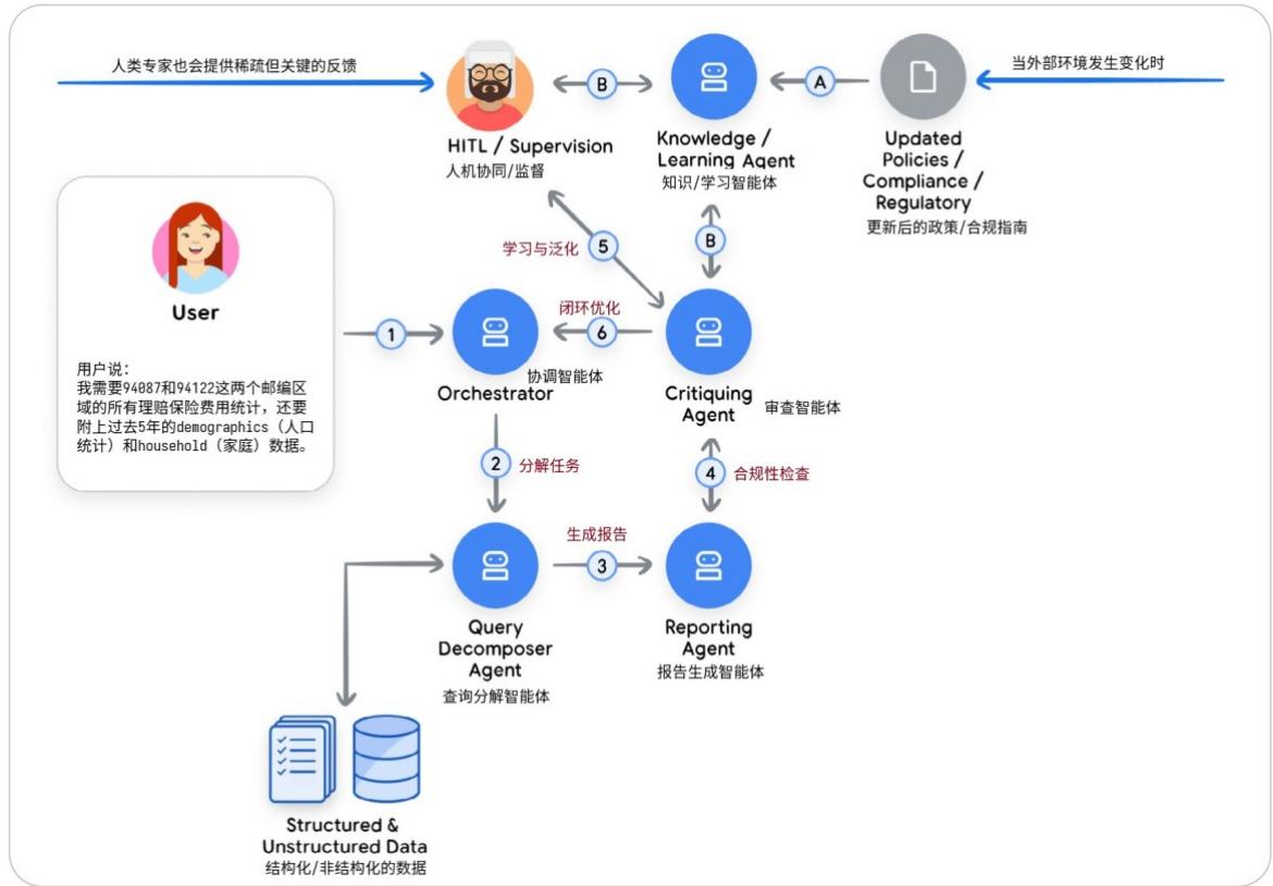 学习智能体(Learning Agent):全程观察整个流程,特别关注人类专家的修正意见,并将这些反馈提炼为可复用的新规则------例如更新审查智能体的判断标准,或优化报告智能体的生成上下文。