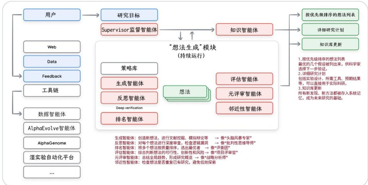 在这个系统中,各类AI智能体会持续工作数小时甚至数天,反复迭代、精炼所生成的科学假设。