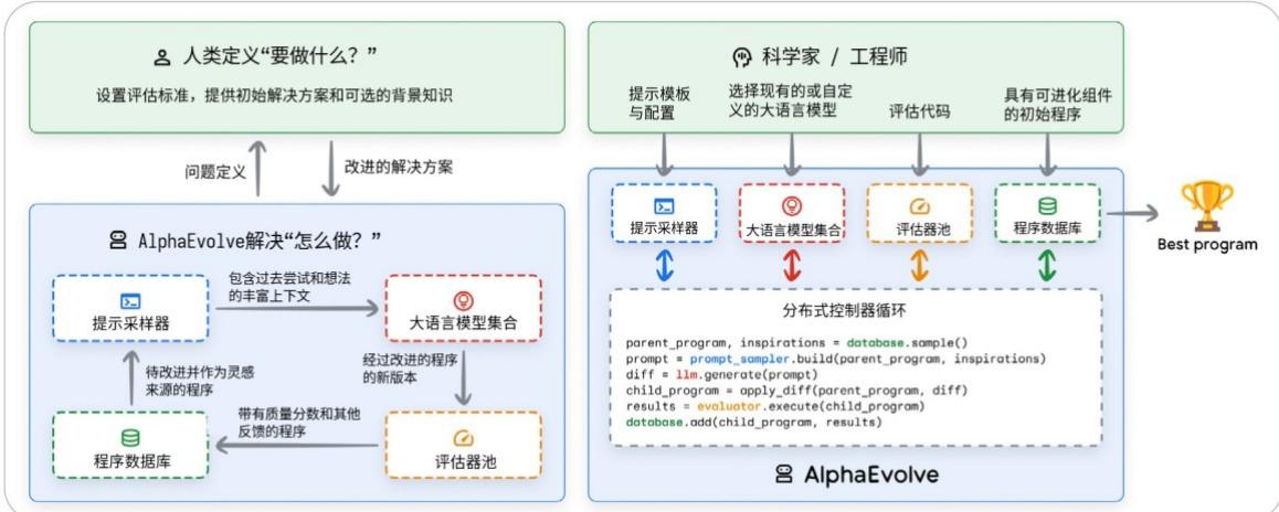 AlphaEvolve的设计核心,是实现人类与AI之间一种深度、持续迭代的协作关系。这种人机合作主要通过两个关键机制来实现:
