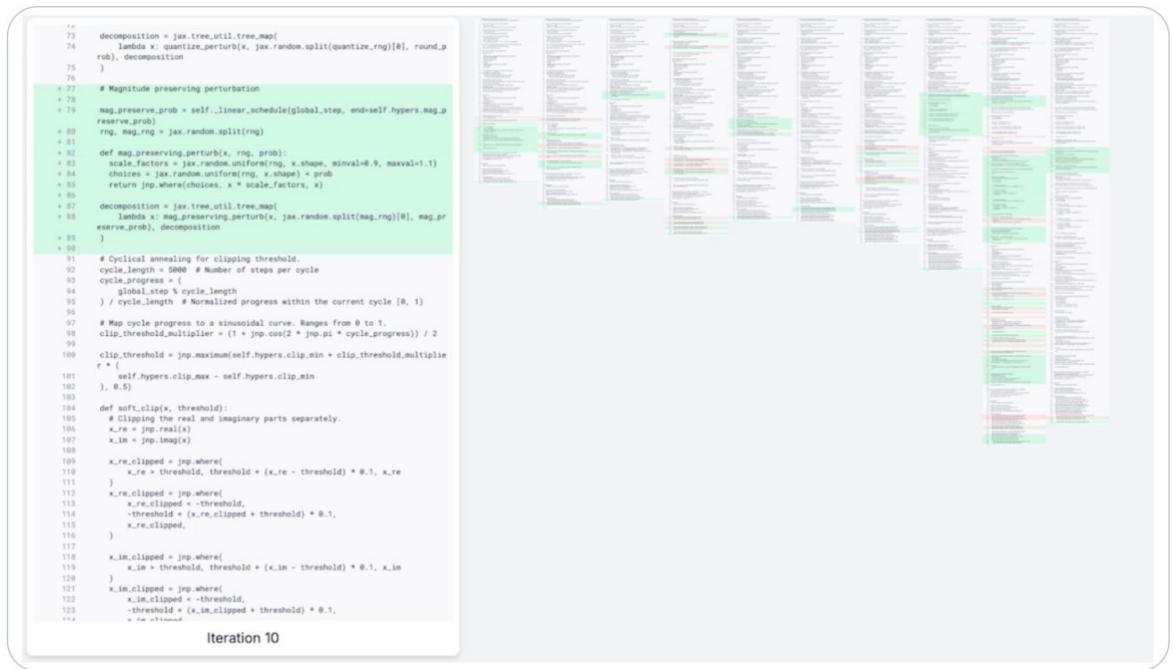 进化:得分最高的方案被保留下来,并作为"基因模板",启发下一代代码的生成。