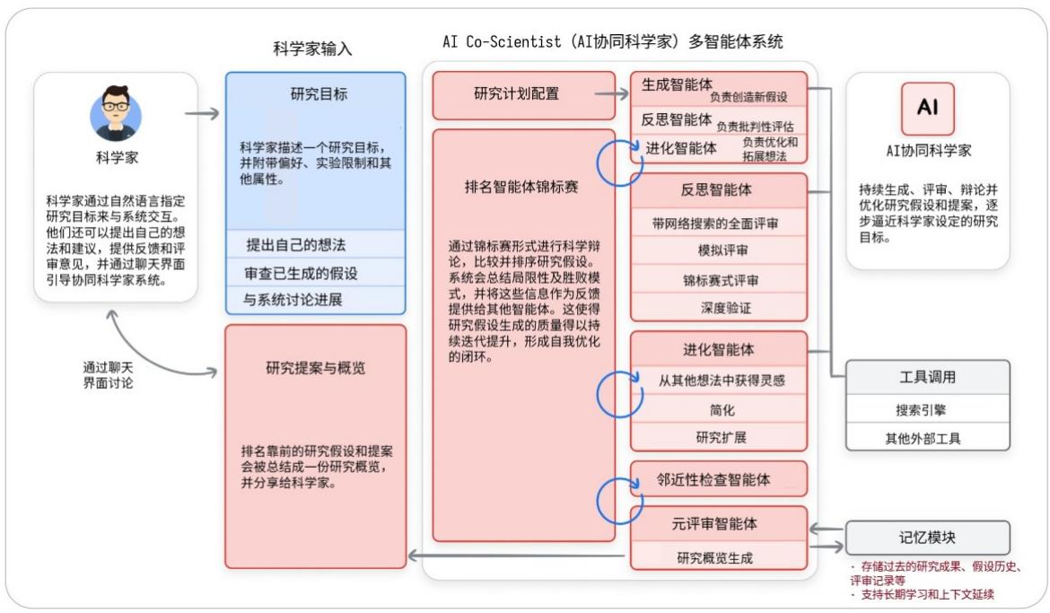 为了实现这一能力,Co-Scientist并非单打独斗,而是构建了一个由多个AI智能体组成的协作生态系统,各司其职、协同推进。