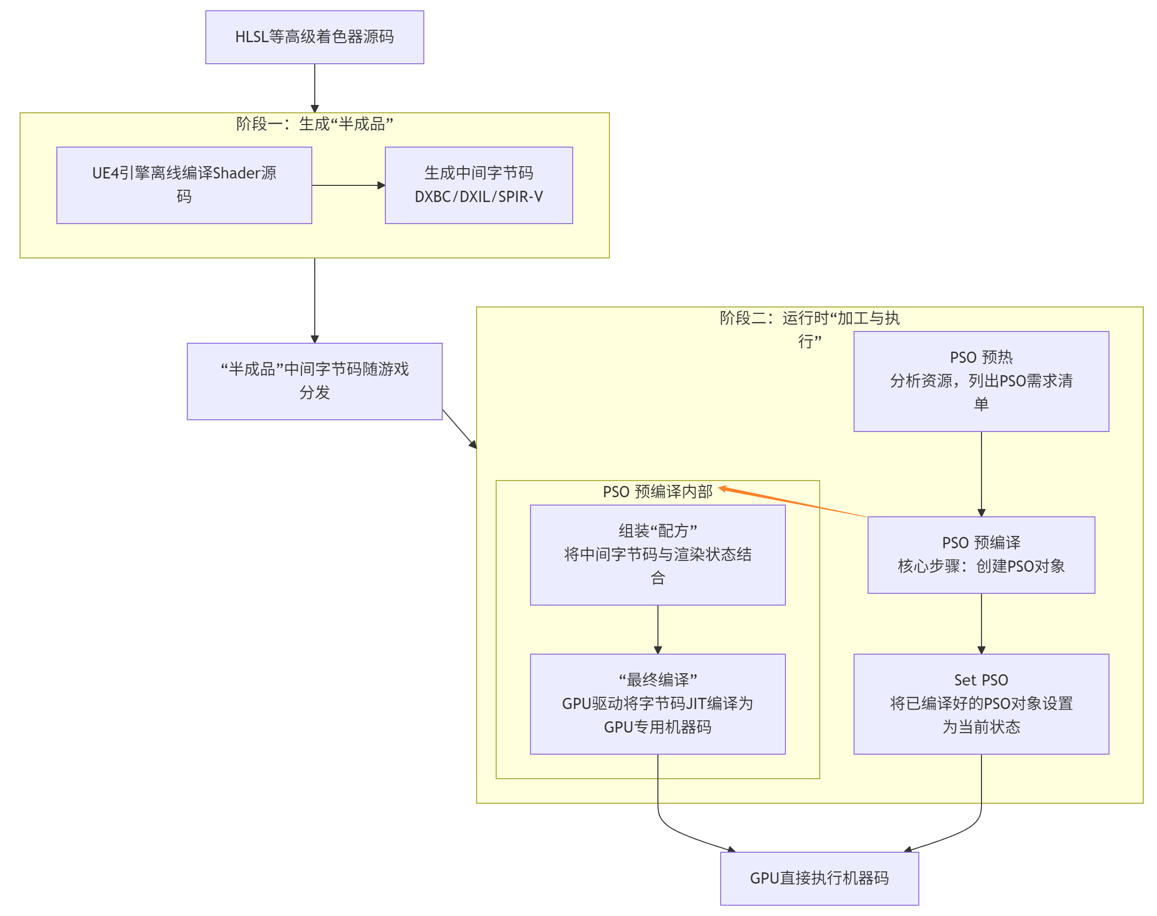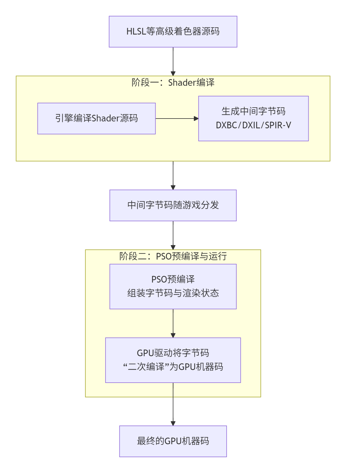 在 "着色器(Shader)的编译" 和 "管线状态对象(PSO)的创建" 这两个发生在不同阶段、不同层级的操作下,有着不同的 "Shader编译" 的概念。下图清晰地展示了从源代码到GPU机器码的完整流程,以及PSO预编译在其中的精确位置。