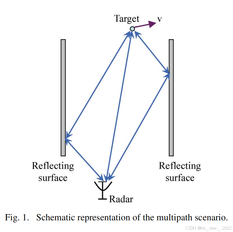 我们考虑在多径丰富的环境中,相对于雷达以恒定相对速度 v ⃗ \vec{\boldsymbol{v}} v 移动的远场点目标,如图 1 所示。在工作频率下,我们假设反射面仅产生雷达信号的镜面反射。我们假设雷达完全了解受监视的环境。