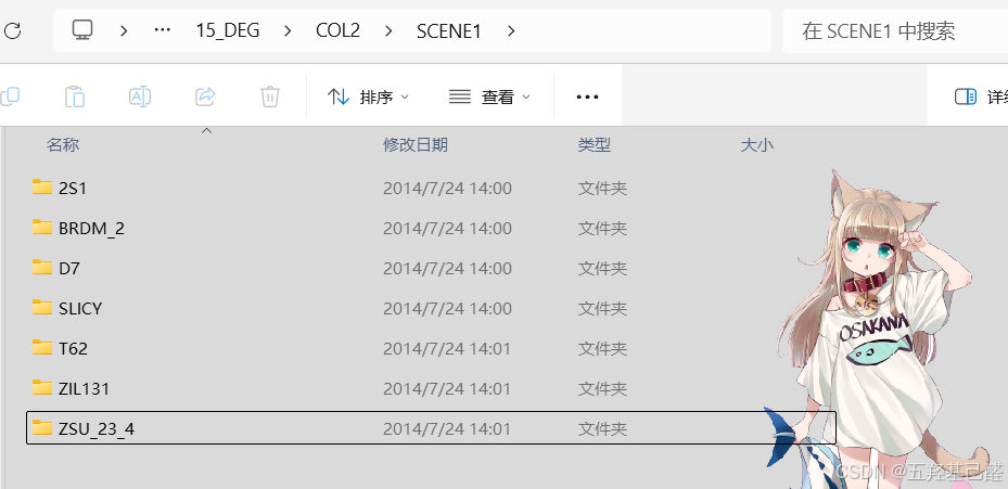 MSTAR文件夹命名依次为俯仰角(DEG)、采集条件(COL1/2, Hb)、场景(SCENE, Hb)、目标(2S1)、目标变体型号。目标数据包括三个不同的地点(新墨西哥州、佛罗里达州北部和阿拉巴马州北部),其中一个地点(佛罗里达北部)在一年的不同时间(5月和11月)有两个收集。MSTAR_PUBLIC_CLUTTER_CD1 和 MSTAR_PUBLIC_CLUTTER_CD2所有的目标地点都是草覆盖和平坦的。