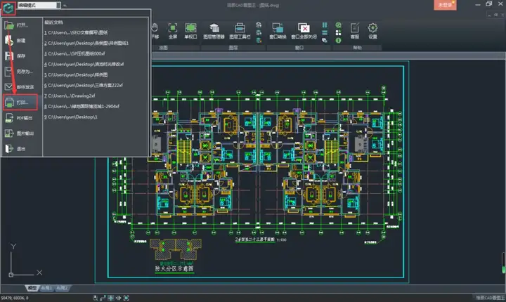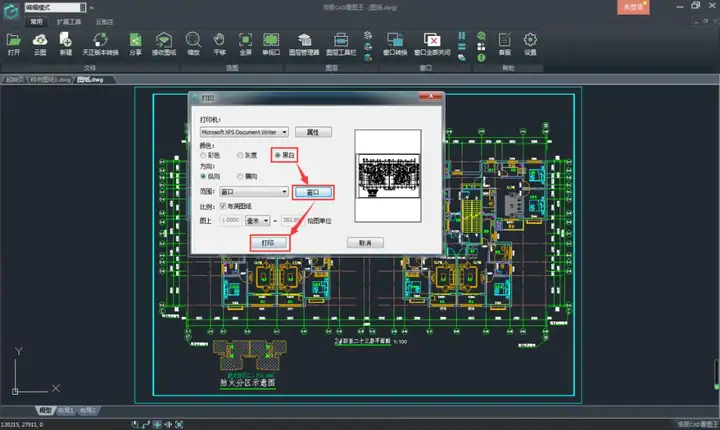 打开图纸后,可以快速浏览图纸,点击图纸界面的左上logo,选择打印,在弹出的对话框中,将颜色选择为黑白。