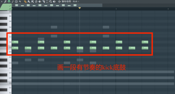 2、设置好节奏之后,我们再来编写Hardstyle音乐的kick鼓,kick鼓是FL Studio默认的鼓组乐器,我们直接在通道机架中调用。编写kick鼓节奏不需要太复杂,只需要编排一些短促、有规律的节奏就可以了。