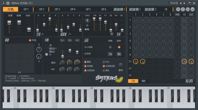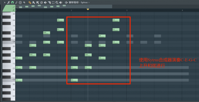 3、接下来就到了主旋律的编写阶段了,Hardstyle音乐的主旋律一般都会用合成器音色来编写。而在FL Studio中,我们可以使用GMS、Sytrus等合成器来作为Hardstyle音乐的合成器音色。