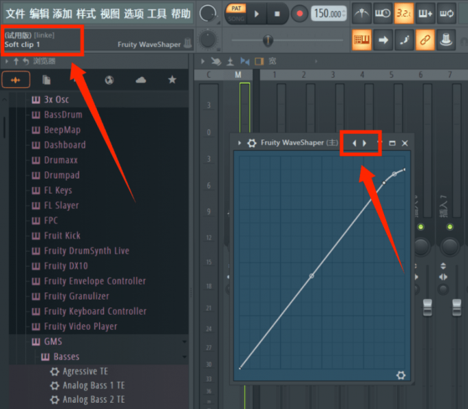 我们在Fruity WaveShaper插件中点击箭头图标,选择"soft clip1"模式,这种软失真效果能够让kick鼓的失真更加自然,同时也不会导致过度失真,能够很好地还原Hardstyle音乐的kick鼓音色。