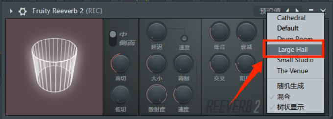 这一步我们同样可以在FL Studio中完成,并且操作十分简单。我们要用到FL Studio中的Fruity Reeverb 2混响器插件。这个插件能够模拟音乐在不同环境下播放的声场,从而让音乐更加自然。我们在插件中可以直接选择"Large Hall"预设,通过Large Hall混响效果来营造出回声,让我们的Hardstyle音乐更加真实。