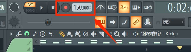 1、在FL Studio界面,首先确定好歌曲的速度,刚才说到Hardstyle音乐的速度一般都比较快,所以我们把速度设置成150BPM。