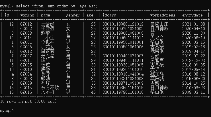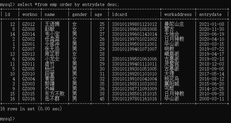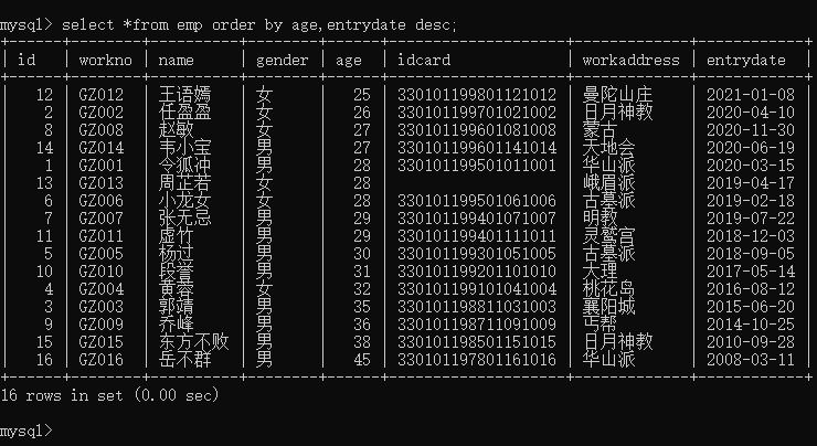 -- 3.根据年龄对公司的员工进行升序排序,年龄相同,再按照入职时间降序排序