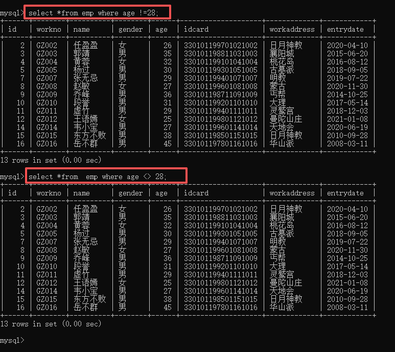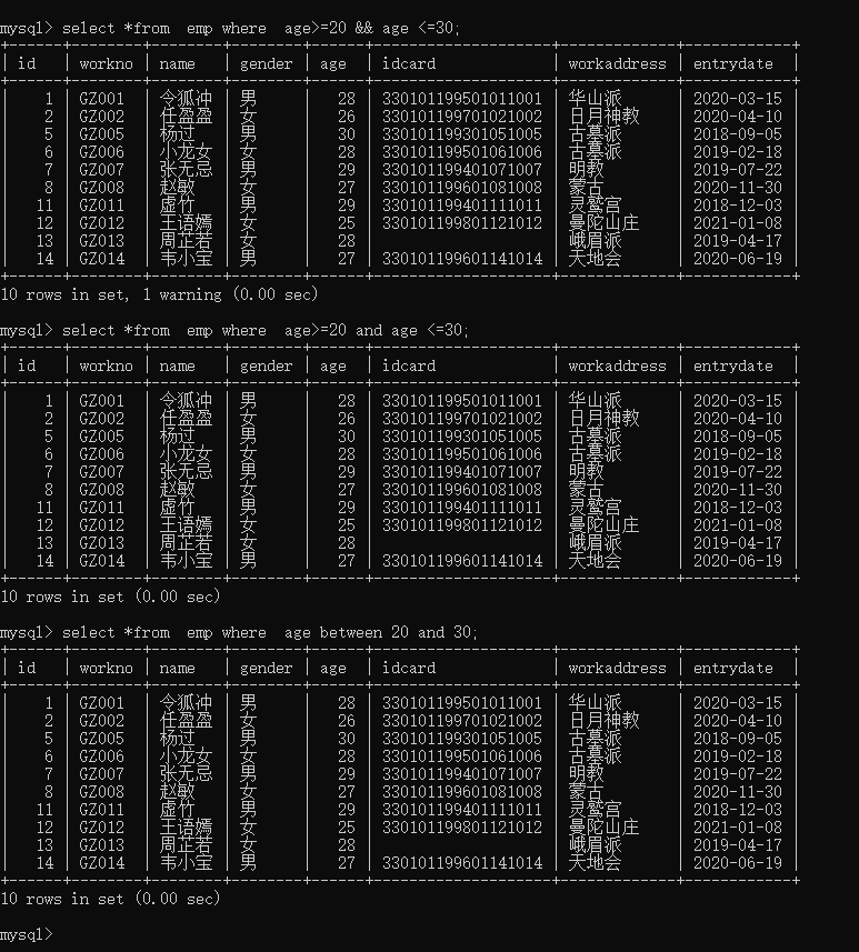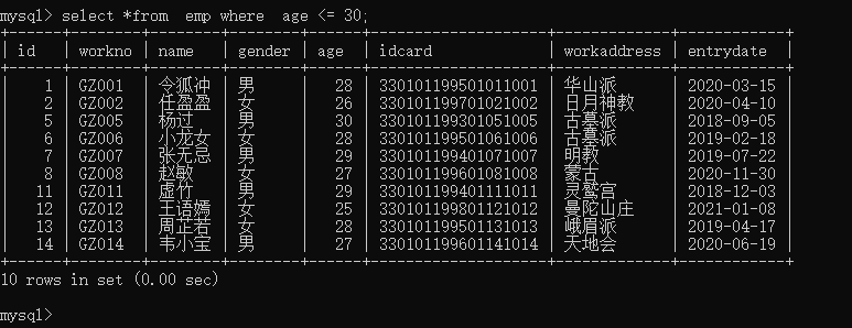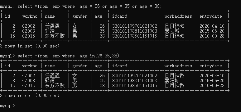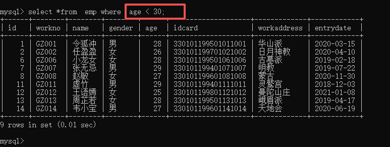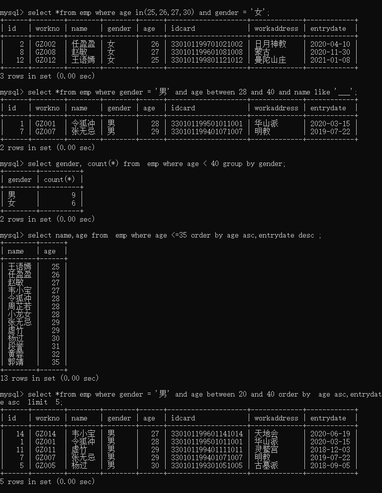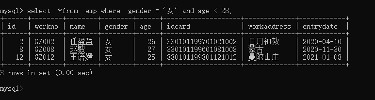 select *from emp where age in(25,26,27,30) and gender = '女';