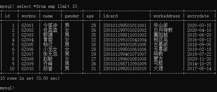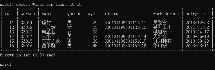 -- 2.查询第2页员工数量,每页展示10条记录(页面 - 1)* 页面展示的记录数