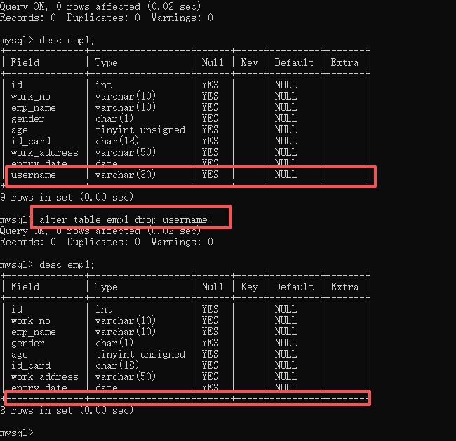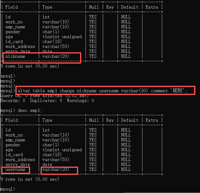 ALTER TABLE emp1 CHANGE nickname username varchar(30) COMMENT '昵称';