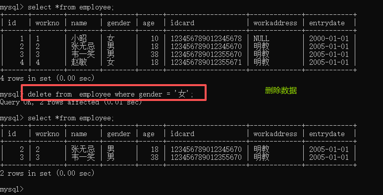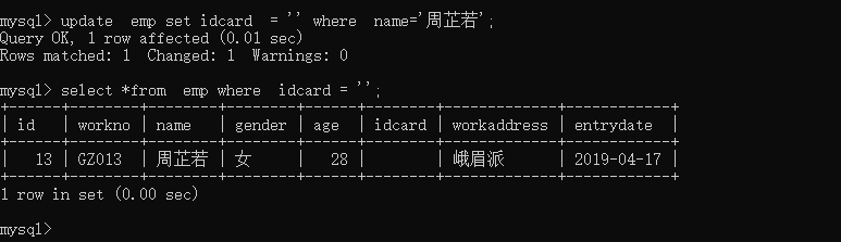 -- 修改id为1的数据,将name修改为小昭,gender 修改为女
