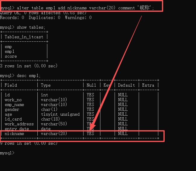 -- 例:ALTER TABLE emp ADD nickname varchar(20) COMMENT '昵称';