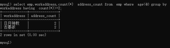 -- 3.查询年龄小于40的员工,并根据工作地址分组,获取员工数量大于等于2的工作地址