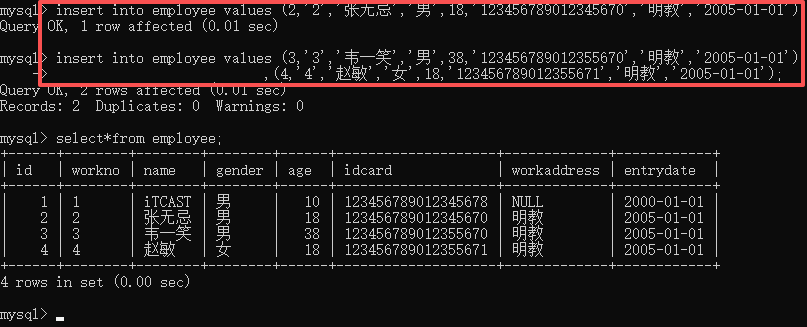 INSERT INTO 表名 VALUES (值1, 值2, ...), (值1, 值2, ...), (值1, 值2, ...);