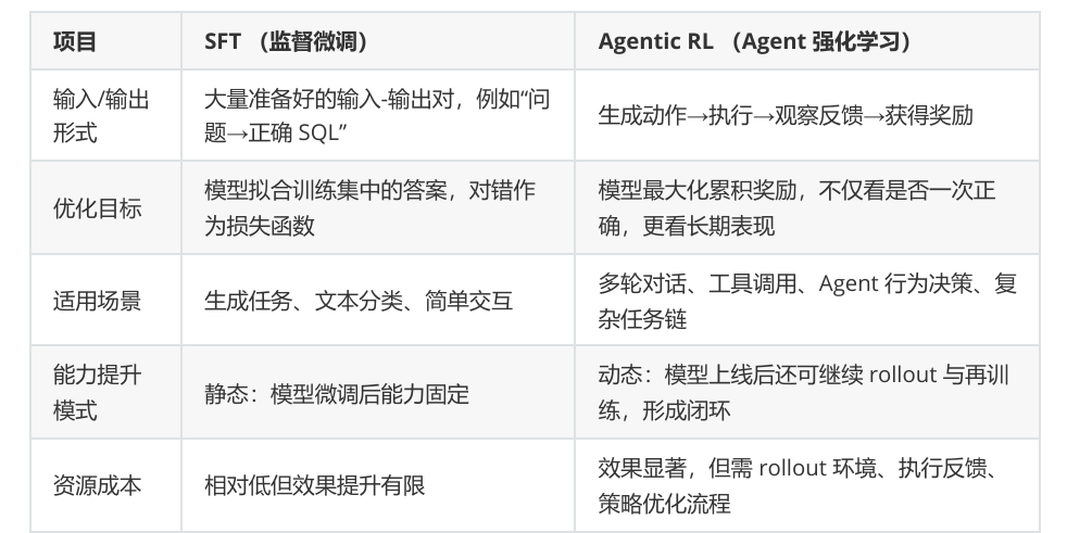 总结:Agent 任务中,模型的核心价值不再是"回答正确",而是"完成任务"。而 Agentic RL 的动态学习机制符合这一逻辑,通过执行与反馈的循环,让 Agent 逐渐学习如何在复杂任务链中实现目标。