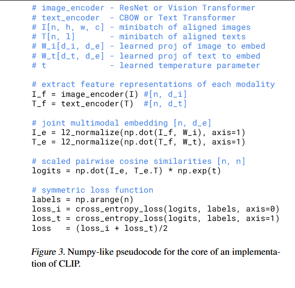 CLIP通过联合训练一个图像编码器和一个文本编码器来学习一个多模态嵌入空间,以最大化批次中N个真实配对的图像和文本嵌入的余弦相似度,同时最小化N²−N个错误配对的嵌入的余弦相似度。在这些相似度得分上优化一个对称的交叉熵损失。