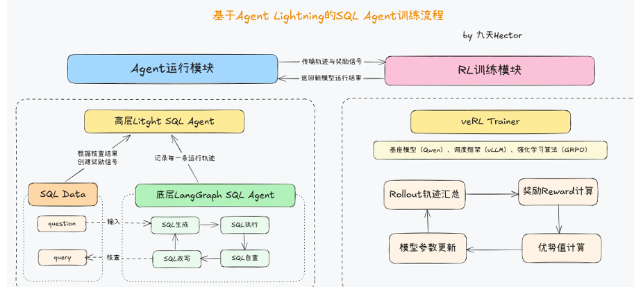 这一部分主要依托 Agent-Lightning 框架与 veRL 训练系统完成。作用是利用运行模块产生的行为轨迹,对底层基座模型进行基于 GRPO 算法的优化,从而实现策略提升与能力迁移。