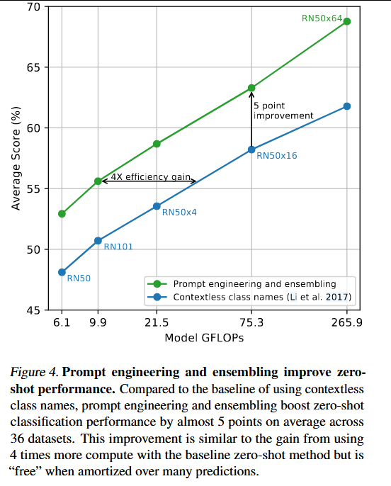 提示工程:实验发现在几个细粒度图像分类数据集上,指定类别是有帮助的,如宠物,数据集,飞机类型...。尝试对多个零样本分类器进行集成:分类器是通过使用不同的上下文提示计算得出的,提示工程和集成将ImageNet的准确率提高了近5%。