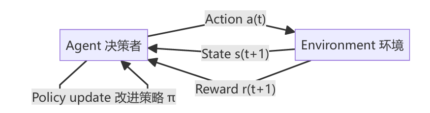 决策---反馈---改进的闭环。在每个时间步 t,智能体依据状态 s(t) 选动作 a(t),环境返回新状态 s(t+1) 与奖励 r(t+1);智能体据此更新策略 π,让自己在未来获得更高的总收益。整个学习过程并不是"先学完再用",而是一边行动、一边吃反馈、一边变更好。