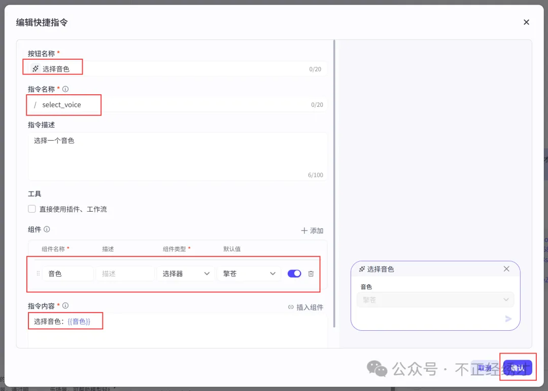 这里的音色voice具体输入什么,需要看工作流中的语音合成插件配置了哪些音色。