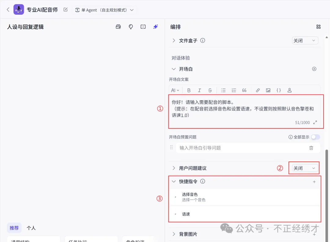 (4)设置开场白 ->关闭用户问题建议 ->添加两个快捷指令;