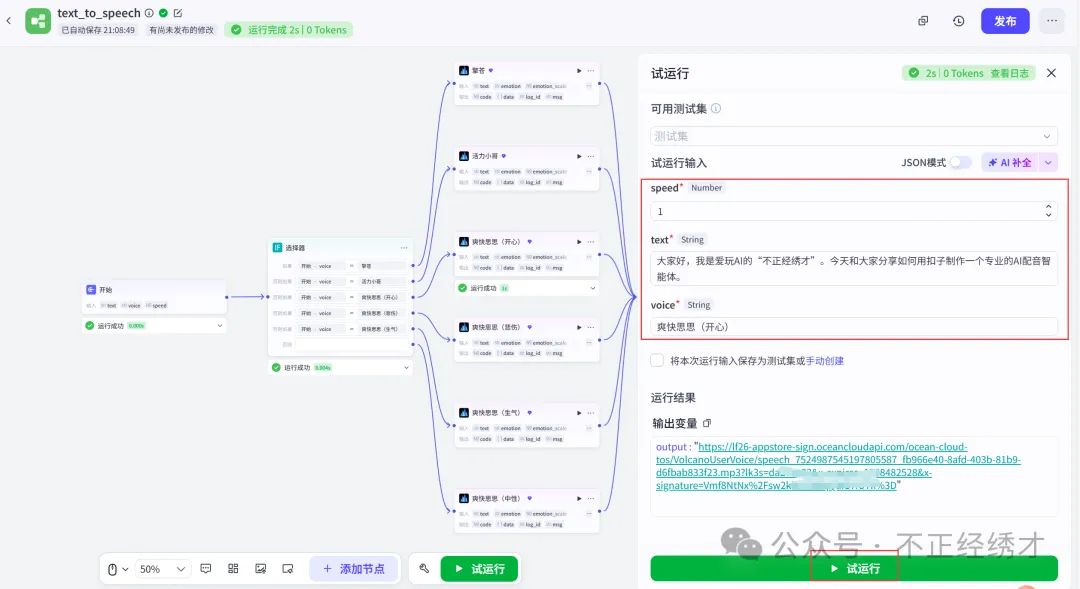 以上就是搭建智能体------专业AI配音师全流程了,最多可以支持160+音色,主要取决于我们给工作流添加的语音插件数量。
