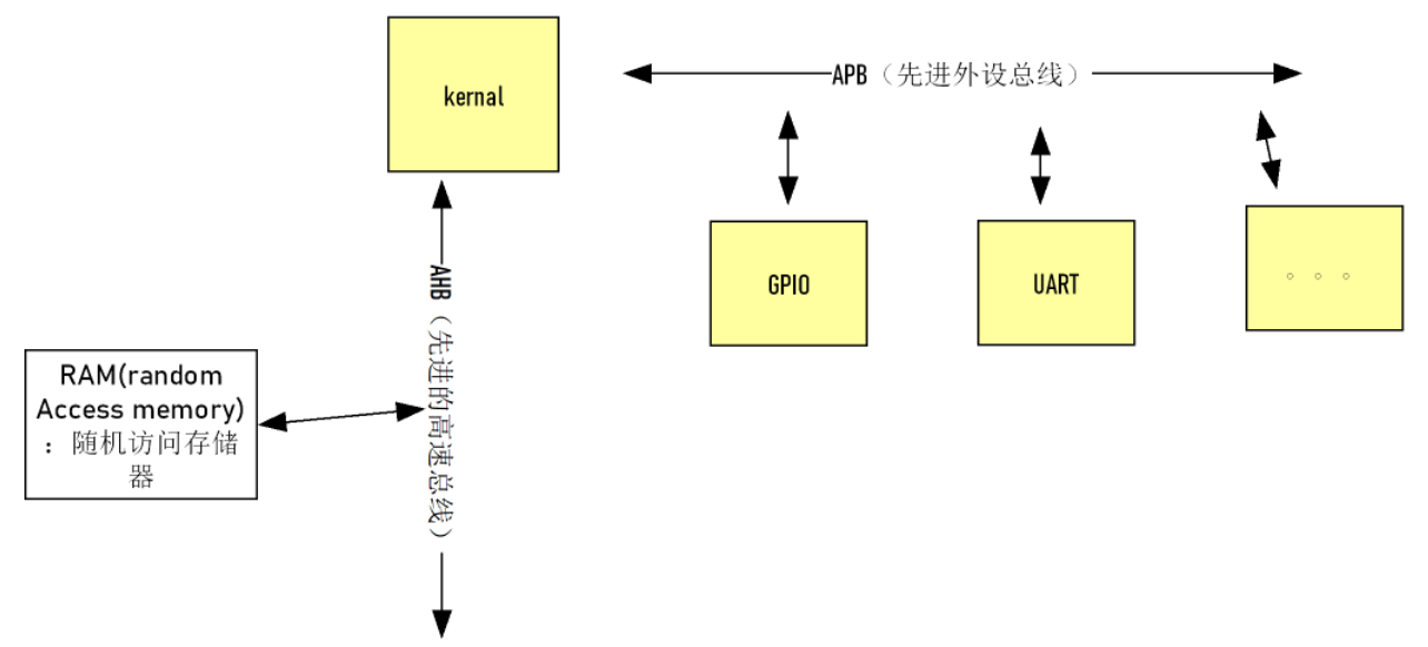 ARM 架构中,外设通过 APB(先进外设总线) 连接,用于 GPIO、UART 等低速外设的数据传输;内存则通过 **AHB(先进高性能总线)**连接,保障高速数据交互。