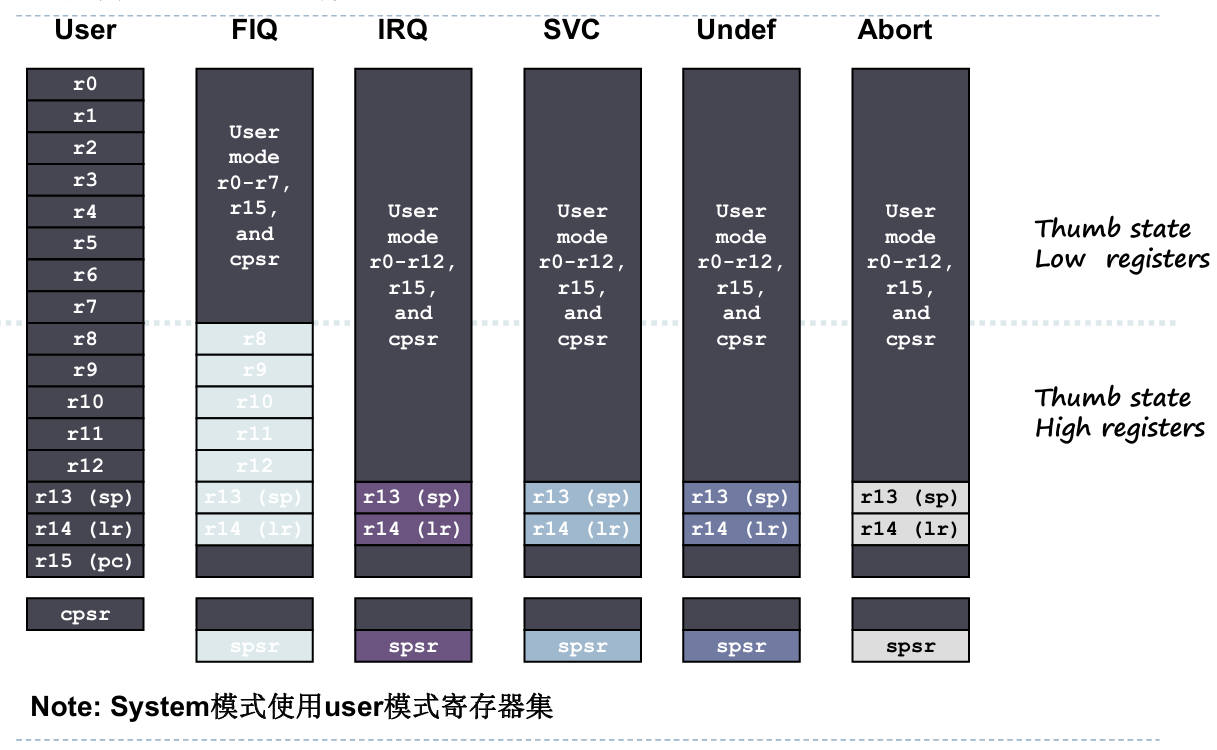 - System(系统模式):特权模式,使用与 User 模式完全相同的寄存器集,供操作系统特权任务使用,避免频繁切换模式。