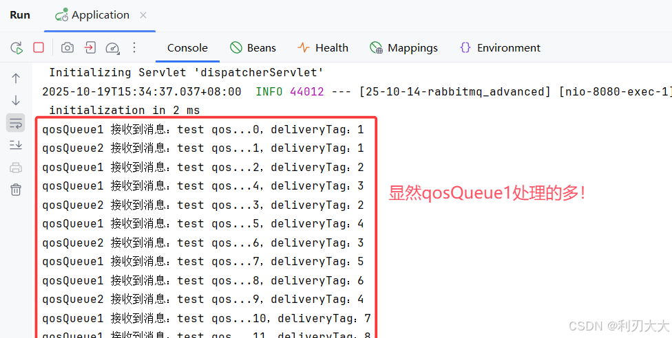 java@Configuration public class QosListener { @RabbitListener(queues = Constants.QOS_QUEUE) public void qosQueue1(Message message, Channel channel) throws IOException, InterruptedException { long deliveryTag = message.getMessageProperties().getDeliveryTag(); System.out.printf("qosQueue1 接收到消息:%s,deliveryTag:%d%n", new String(message.getBody()), deliveryTag); Thread.sleep(1000); // 模拟快业务处理,1s channel.basicAck(deliveryTag, true); } @RabbitListener(queues = Constants.QOS_QUEUE) public void qosQueue2(Message message, Channel channel) throws IOException, InterruptedException { long deliveryTag = message.getMessageProperties().getDeliveryTag(); System.out.printf("qosQueue2 接收到消息:%s,deliveryTag:%d%n", new String(message.getBody()), deliveryTag); Thread.sleep(2000); // 模拟慢业务处理,2s channel.basicAck(deliveryTag, true); } }