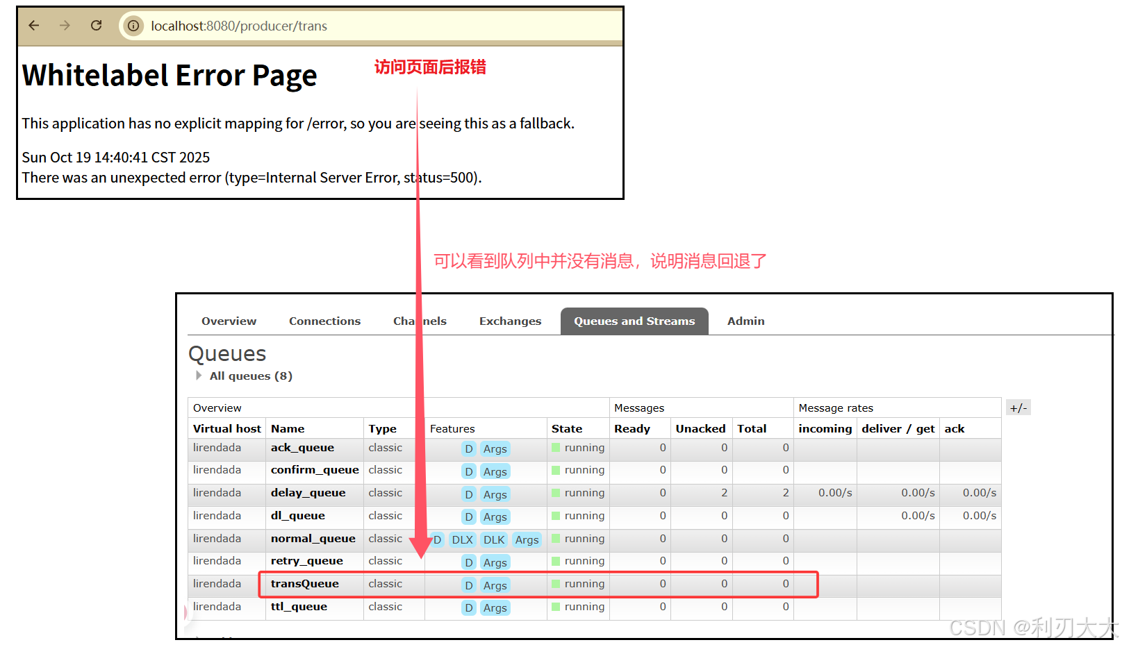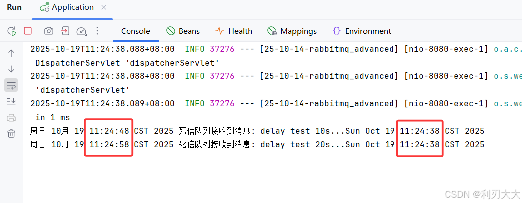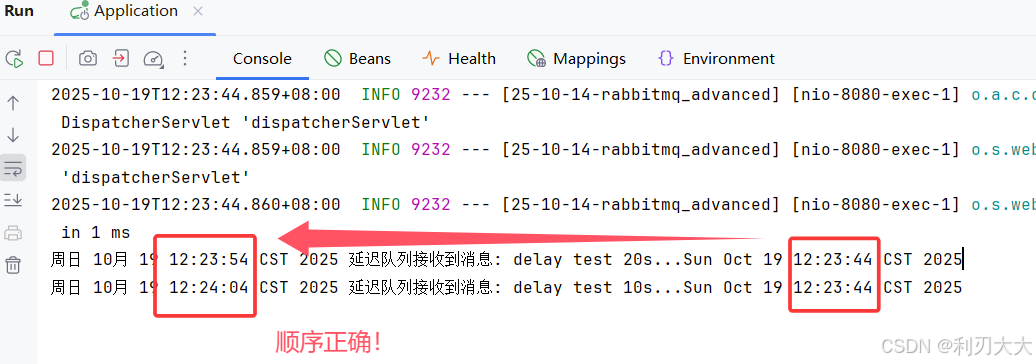 java@RequestMapping("/delay") public String delay() { // 发送两条单独带TTL的消息 rabbitTemplate.convertAndSend(Constants.NORMAL_EXCHANGE, "normal", "delay test 10s..." + new Date(), message -> { message.getMessageProperties().setExpiration("10000"); // 延迟10s到达死信队列 return message; }); rabbitTemplate.convertAndSend(Constants.NORMAL_EXCHANGE, "normal", "delay test 20s..." + new Date(), message -> { message.getMessageProperties().setExpiration("20000"); // 延迟20s到达死信队列 return message; }); return "发送成功!"; } -
