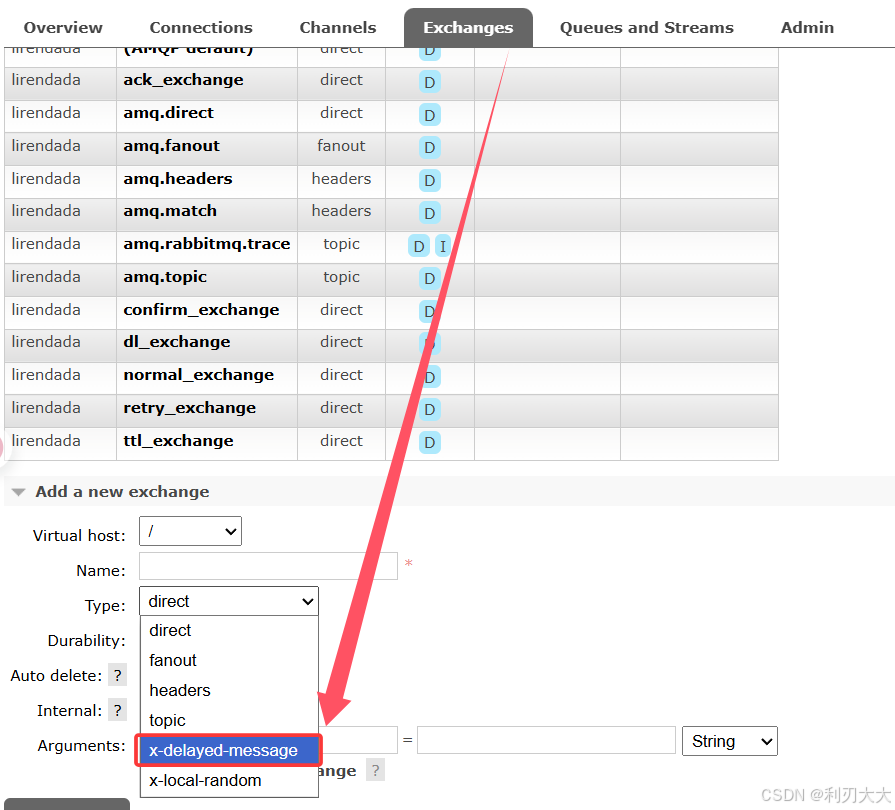 在 RabbitMQ 管理平台查看,新建交换机时是否有延迟消息选项,如果有就说明延迟消息插件已经正常运行了。