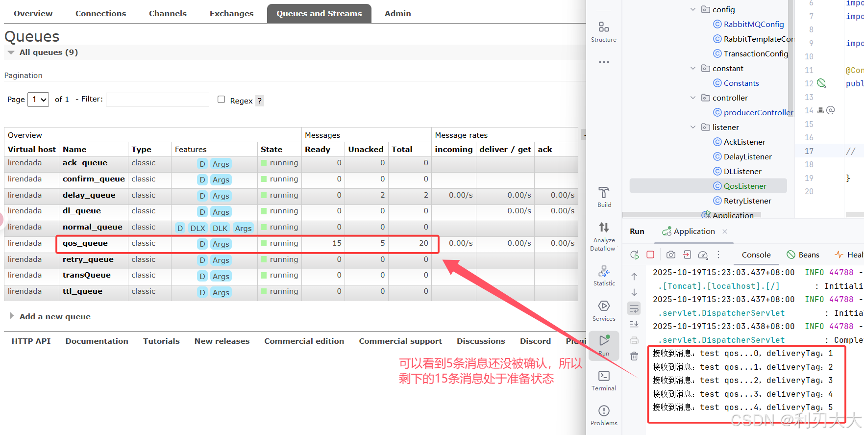 java@Configuration public class QosListener { @RabbitListener(queues = Constants.QOS_QUEUE) public void qosQueue(Message message, Channel channel) throws IOException { long deliveryTag = message.getMessageProperties().getDeliveryTag(); System.out.printf("接收到消息:%s,deliveryTag:%d%n", new String(message.getBody()), deliveryTag); // channel.basicAck(deliveryTag, true); // 注释掉,不进行确认,观察现象 } }