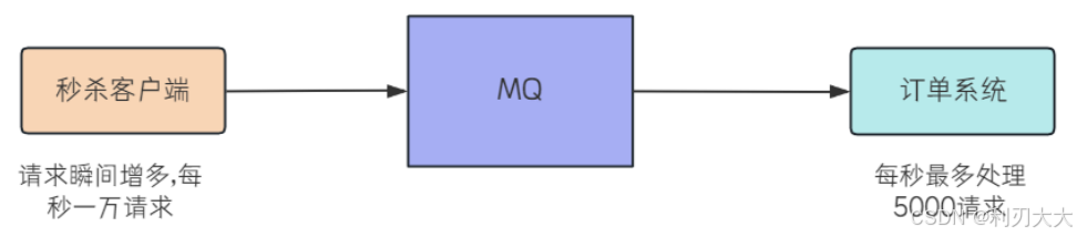 但是在秒杀时间点,请求瞬间增多,每秒 1w 个请求,如果这些请求全部通过 MQ 发送到订单系统,无疑会把订单系统压垮。