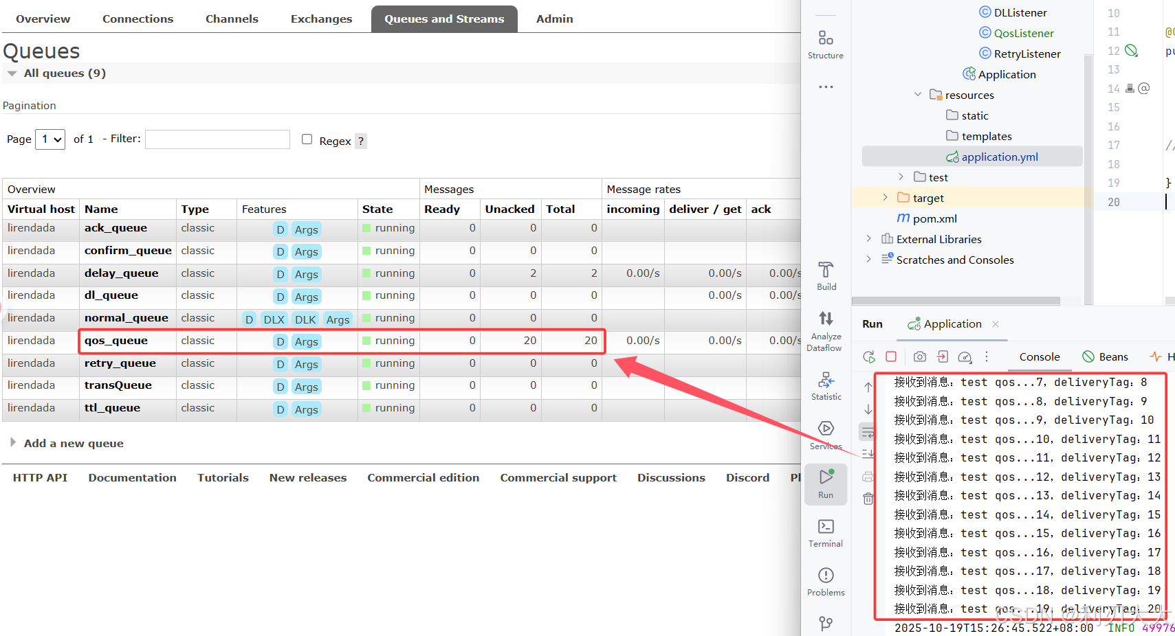 java@RequestMapping("/qos") public String qos() { for(int i = 0; i < 20; ++i) { rabbitTemplate.convertAndSend(Constants.QOS_EXCHANGE, "qos", "test qos..." + i); } return "发送成功!"; } -