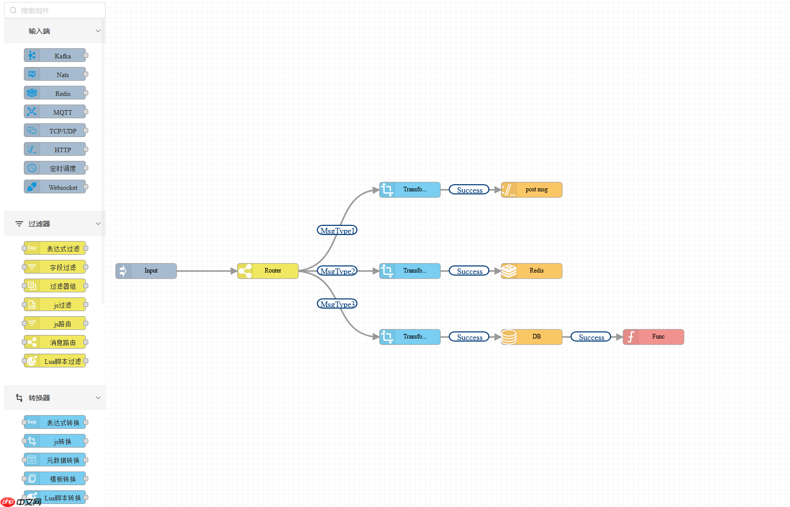 OnMsg核心逻辑后,根据执行结果(Success/Failure/True/False)按连线规则跳转至下一个节点,支持多分支、循环逻辑。 - 执行终止:当节点无后续连线、触发终止条件或出现异常时,规则链执行结束,可通过回调函数获取执行结果与错误信息。