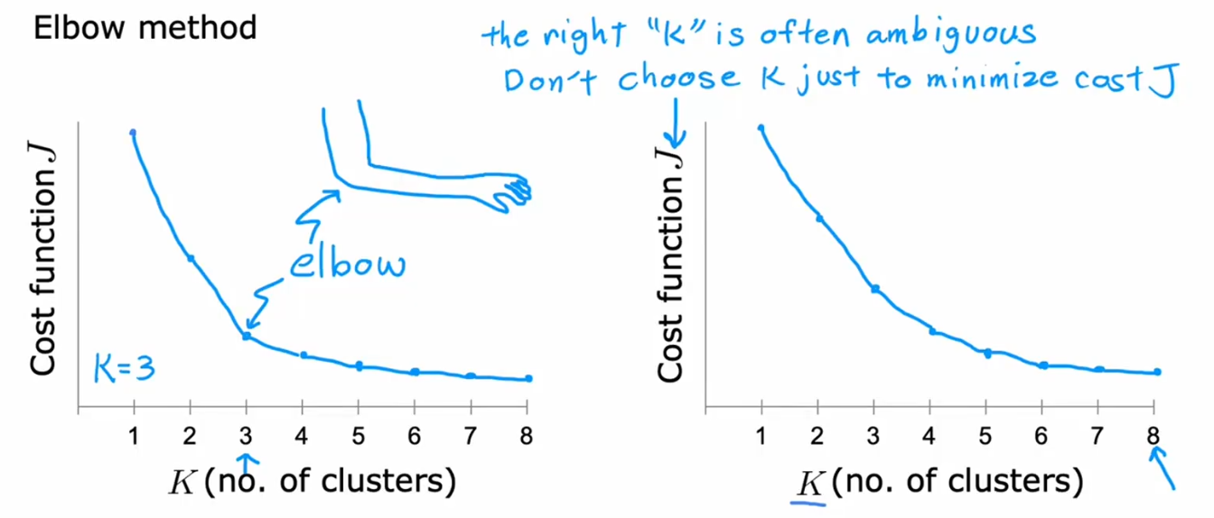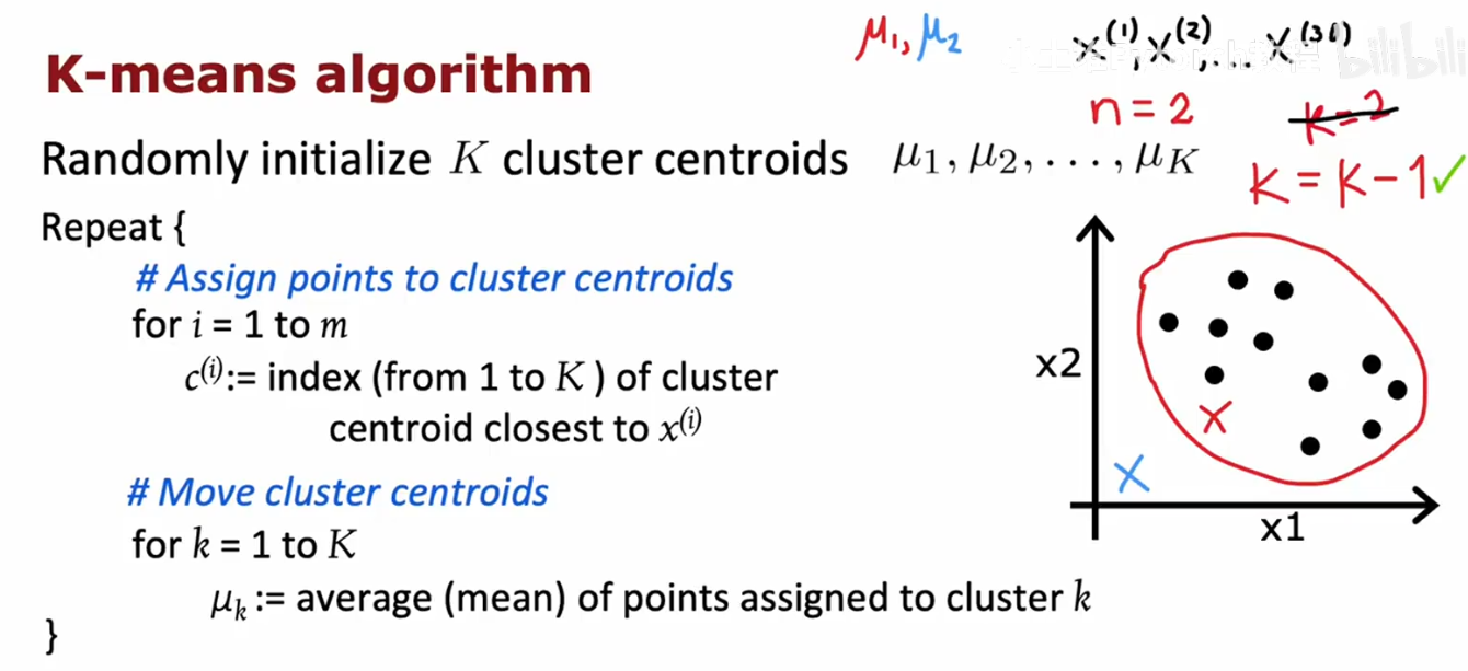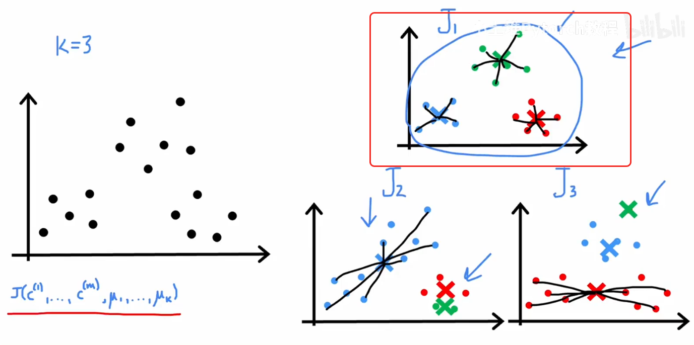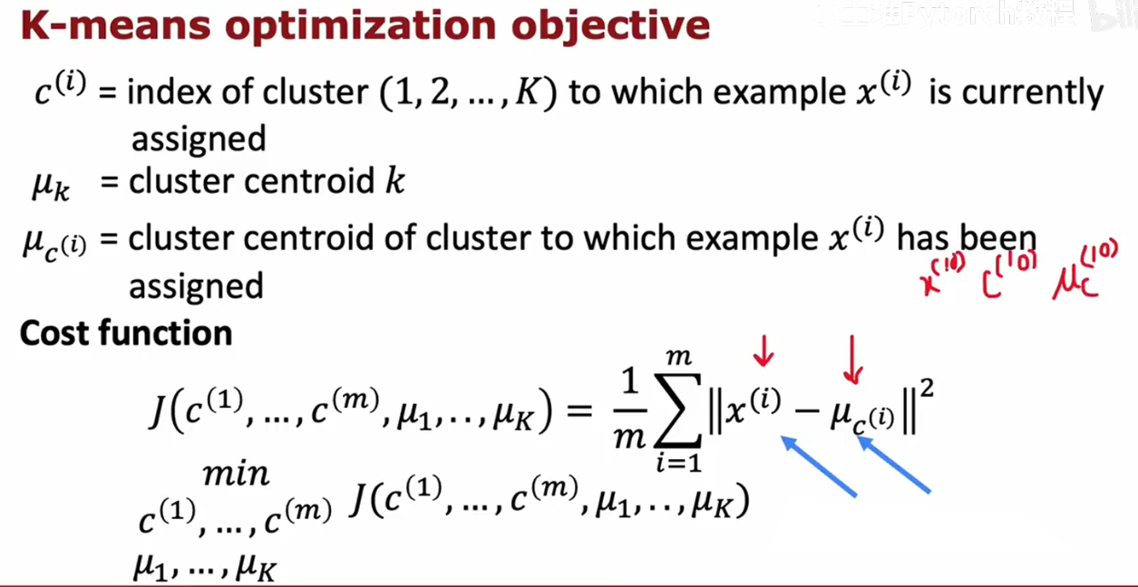 之前提到的初始化是随机点,而聚类算法中常用的是用训练数据集中的K个点作为初始化的聚类中心,而这K个点的选择要使得当前的代价函数最低,便是最优,图中红框部分既是最优