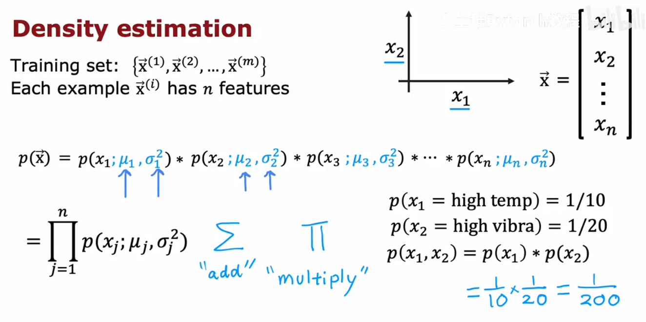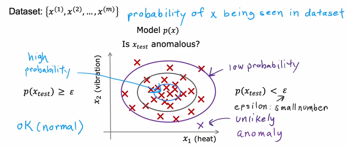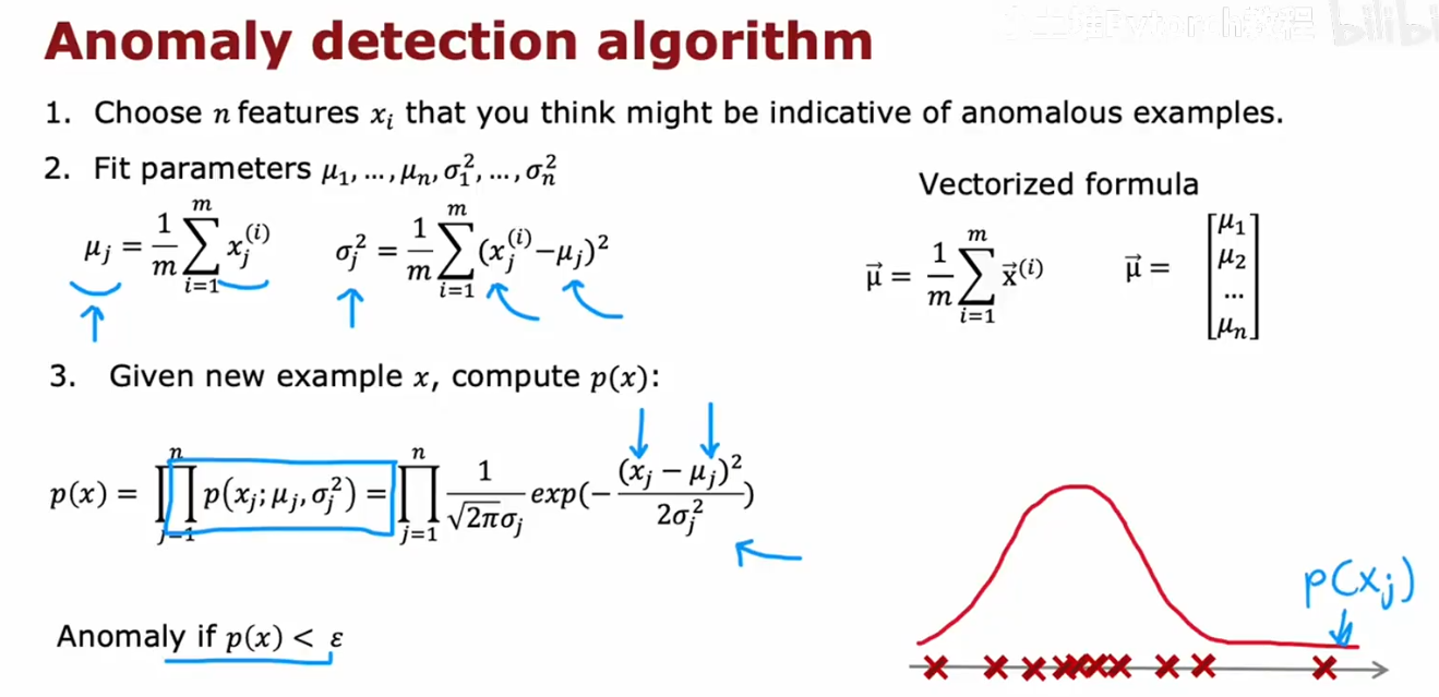 我们认为密度越大的区域,特征取值概率越高,就越正常,越稀疏就表示可能存在问题,当我们的x_test的概率p(x_test)小于某个阈值时候,我们就需要将其标记为异常,从而进行检测