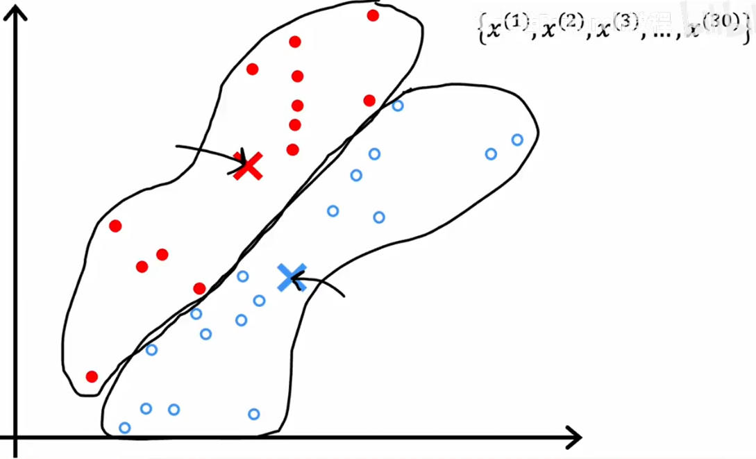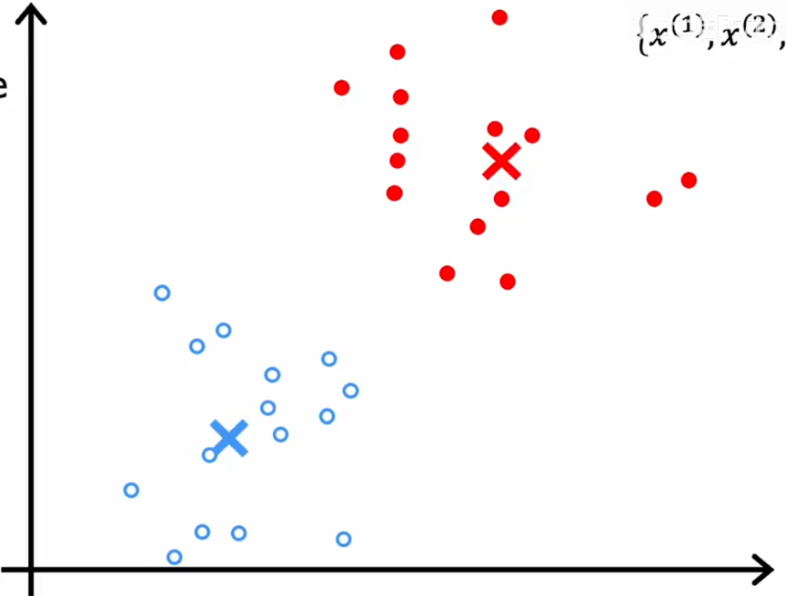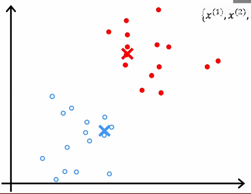 - 随机猜测你可能要求算法找到的聚类的中心,示例中首先随机找两个点作为聚类中心